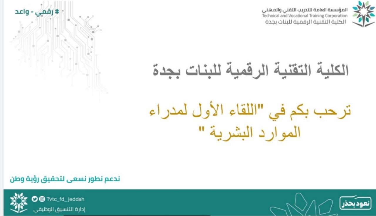 برعاية مدير عام التدريب التقني والمهني بمنطقة مكة المكرمة الأستاذ فيصل كدسة تم إطلاق مشروع حاضن (التدريب والتأهيل المنتهي بالتوظيف ) من خلال اللقاء الأول لمدراء الموارد البشرية والذي نظمته إدارة التنسيق الوظيفي بالكلية التقنية الرقمية للبنات بجدة ، عبر البلاك بورد ، وقد حضر اللقاء عدد من مدراء الموارد البشرية من القطاع الخاص والعام بالإضافة لعدد من متدربات الكلية ، حيث بلغ عدد الحضور (٢٥٠) مشاركا ..