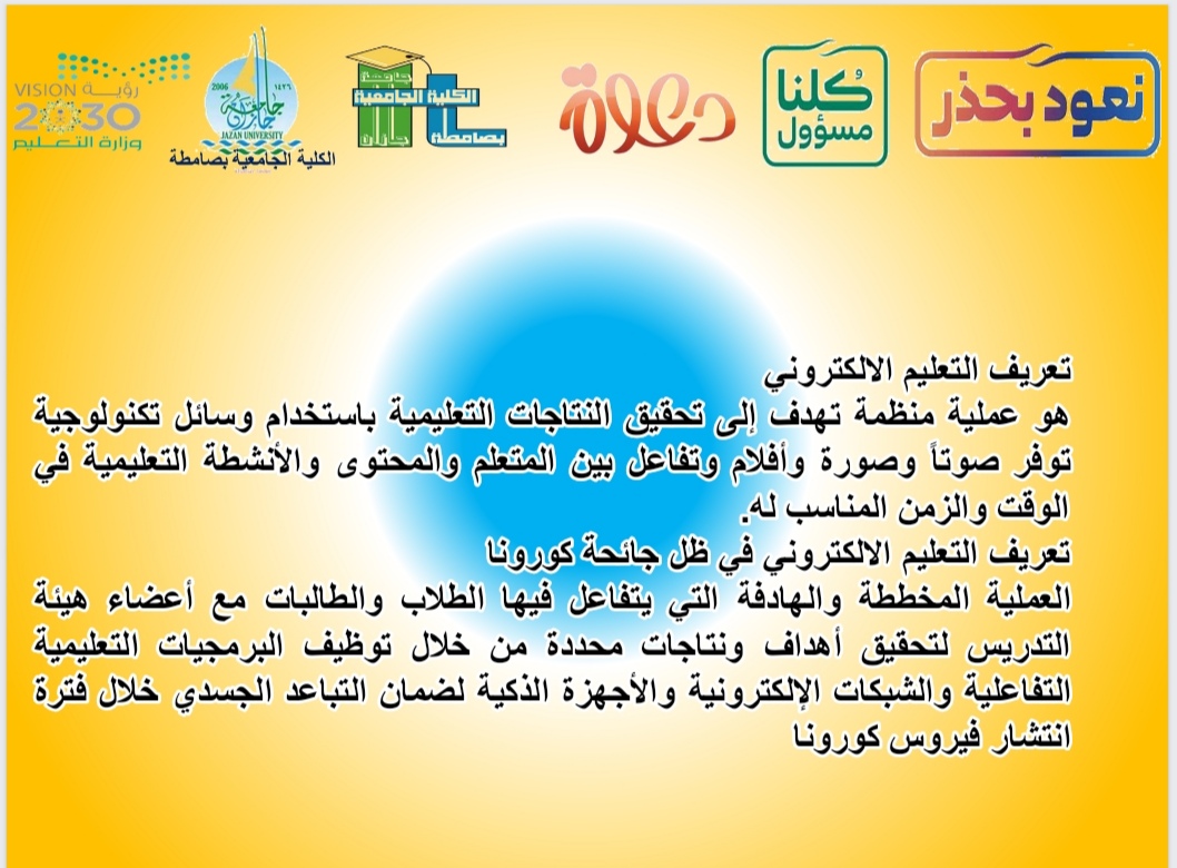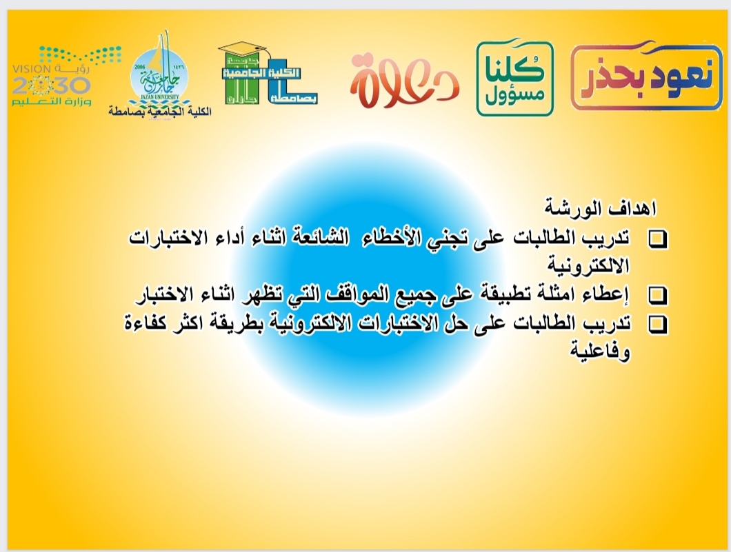 نظمت وحدة التعليم الإلكتروني بالكلية الجامعية بصامطة ورشة عمل بعنوان الاختبارات الإلكترونية – إرشادات ونصائح تطبيقية من تنفيذ الدكتورة /فاطمة الشرقاوي عبر منصةzoom الإلكترونية وكانت الفئة المستهدفة طالبات الكلية والهدف منها تدريب الطالبة على تجنب الأخطاء الشائعة أثناء أداء الاختبارات الإلكترونية وإعطاء أمثلة تطبيقية على جميع المواقف التي تظهر أثناء الاختبار وحل الاختبارات الإلكترونية بطريقة أكثر كفاءة وفاعلية تطرقت لعدة محاور من أبرزها التعريف بالتعليم الإلكتروني إذ يعتبر عملية منظمة تهدف إلى تحقيق النتاجات التعليمية باستخدام وسائل تكنولوجوية وكذلك بينت أهداف التعليم الإلكتروني منها مواكبة التطور العلمي والثورة المعرفية الهائلة وتشجيع التعلم المستمر للمتعلم ومواجهة العجز في الكوادر التعليمية المؤهلة وكذلك إعداد جيل قادر على التعامل مع التقنية وتقديم الخدمات المساندة في العملية التعليمية ثم دور التعليم الإلكتروني بمنصاته التعليمية المختلفة في مواجهة الأزمة العالمية كوفيد 19 وقد أوضحت لهن كيفية اداء الاختبارات الإلكترونية النهائية بكفاءة وفاعلية وذلك بمراجعة تعليمات الاختبار قبل بدايتها لكي تتعرفي على أهم التعليمات التي يجب عليك الالتزام بها