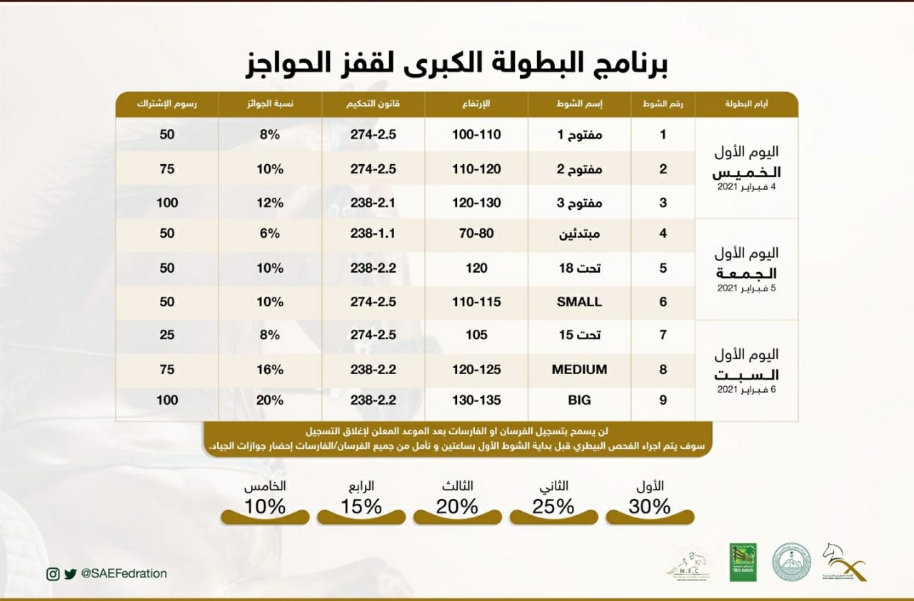 أنطلقت يوم أمس الخميس ولمدة (3) أيام .. البطولة الوطنية لقفز الحواجز (4) بمركز المطبقاني للفروسية بجدة برعاية دجاج رضوى وسدكو القابضة وقشطة التاج وذلك بمشاركة عددا” من الفرسان السعوديين الدوليين أبطال المملكة المعروفين ..كما شهدت البطولة عودة الفارسة السعودية الدولية المخضرمة أروى المطبقاني بعد إنقطاع دام (12) عاما” والتي أبهرت الحضور بمستواها المميز وأدائها اللافت والذي نال إعجاب وإستحسان الجميع ..هذا وقد أسفرت نتائج اليوم الأول للبطولة على النحو التالي :