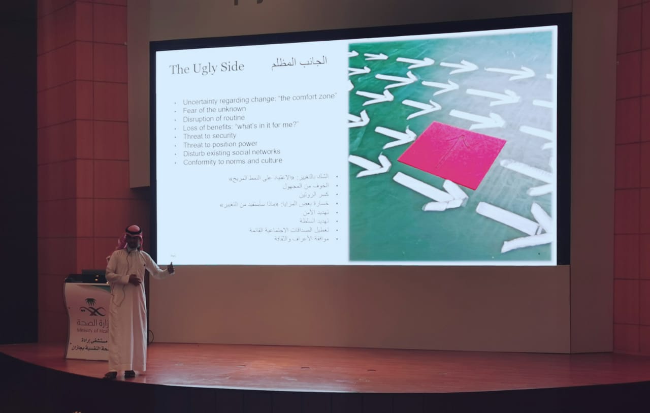 نظمت إدارة التمريض بصحة جازان بالتعاون مع إدارة المعرفة والتواصل ومكتب مشروع نموذج الرعاية بإدارة التحول برنامج (التحول الصحي) وذلك بقاعة المؤتمرات بمستشفى إرادة للصحة النفسية واستمر لمدة يومين.