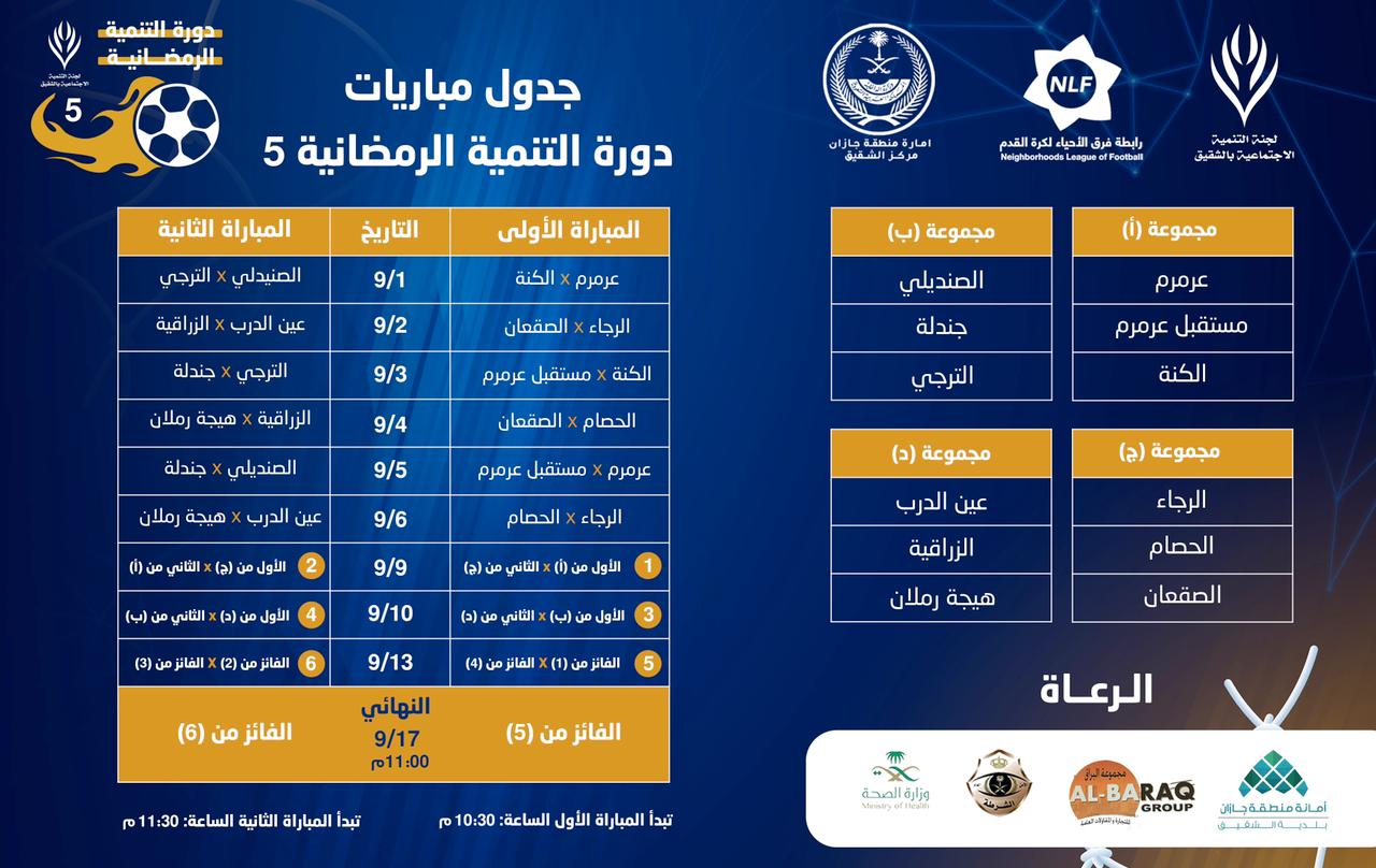تنطلق مساء غدٍ الدورة الرمضانية لكرة القدم التي تنظمها لجنة التنمية الاجتماعية الأهلية بمركز الشقيق التابع لمحافظة الدرب برعاية من مركز الشقيق ومشاركة بلدية الشقيق و رابطة الأحياء لكرة القدم ، وذلك على ملعب البراق بالشقيق .