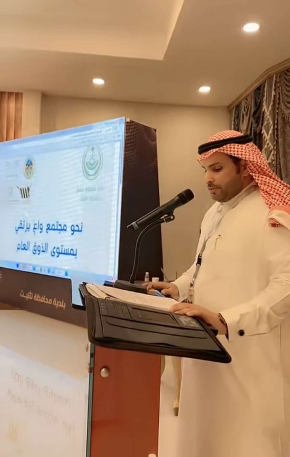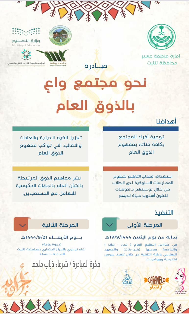 ضمن مبادرات أجاويد التي أطلقتها هيئة تطوير منطقة عسير نفذ فريق عمل مبادرة ” نحو مجتمع واعٍ يرتقي بمستوى الذوق العام ” بتثليث يوم الأربعاء الموافق 21 / 9 / 1444 هـ وبشراكة مجتمعية مع مكتب التعليم بتثليث ( بنين – بنات ) وجامعة بيشة و المعهد الصناعي الثانوي وفرع كلية التقنية بتثليث و بلدية تثليث و مركز ميمي للتجميل مبادرة تحت عنوان ( نحو مجتمعٍ واعٍ يرتقي بمستوى الذوق العام ) وقد تم تنفيذها على مرحلتين المرحلة الأولى ميدانيًا في جميع المدارس و الجامعات و المعهد الصناعي الثانوي وفرع كلية التقنية بالمحافظة و المرحلة الثانية من خلال لقاء توعوي حضره سعادة محافظ تثليث الأستاذ : محمد بن سعيد بن جزوا ورؤساء ومديري الدوائر الحكومية وعدد من الإعلاميين و الإعلاميات حيث افتتح اللقاء بالسلام الملكي ثم آيات من القرآن الكريم تلاها كلمة لفريق المبادره ألقاها رئيس الفريق الأستاذ : فهد عوض القحطاني ثم ألقى الأستاذ : خالد بن ضويحي كلمة أوضح فيها مفهوم الذوق العام وكان هنالك مداخلة من الأستاذ : خالد محمد الصفيان مؤسس مبادرة الذوق العام بالمنطقة الشرقية والتي من خلالها تم شرح كامل مبادرة الذوق العام و تم خلال اللقاء استعراض بنود لائحة مخالفات الذوق العام مع المستشار القانوني الأستاذ : صالح الزيدان و اختتم اللقاء بعرض مرئي عن ثقافة الذوق العام و تكريم للجهات المشاركة و الداعمين . |
