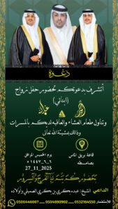 | جازان حسن عباس احتفل الشيخ عبده بكري بن بكري الصميلي بزواج نجليه أحمد وعبدالله، وذلك وسط حضور كبير من المشايخ والأعيان والأهل والزملاء، إلى جانب جمع غفير من الضيوف من داخل المنطقة وخارجها. وأُقيم الحفل في قاعة بريق الماس بمحافظة صامطة يوم الخميس الموافق 1447/6/6، في أجواء مفعمة بالفرح والسرور، تبادل فيها الحضور التهاني والتبريكات بهذه المناسبة السعيدة، سائلين الله تعالى أن يبارك للعروسين وأن يجمع بينهما في خير. وقد عبّر الشيخ عبده الصميلي عن شكره وتقديره لكل من لبّى الدعوة وشارك الأسرة فرحتها، مؤكداً أن حضورهم أسهم في إضفاء مزيد من البهجة على هذه المناسبة الكريمة. |