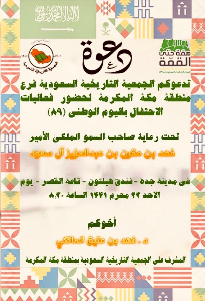 أفاد بذلك سعادة الدكتور / فهد بن عتيق المالكي ( المشرف على الجمعية التاريخية السعودية بمنطقة مكة المكرمة ) – كما يدعو الجميع للمشاركة و الحضور و الإحتفال بهذا اليوم البيهج ؛ علما بأن الدعوة عامة ومفتوحة للجميع …