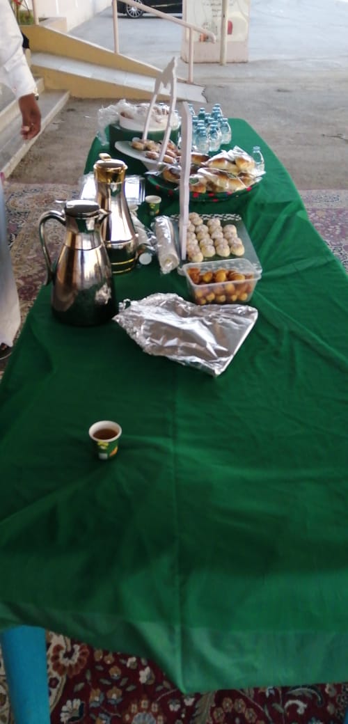 وأظهرت احدى الصور ابتكار الحارس ابو خيرات بهذه المناسبة الغالية وضع طاولة كبيرة متنوعة تحمل العصائر والحلويات والبسكويتات اللذيذة والمعجنات والشعارات الوطنية بحيث تستطيع كل طالبة اخذ ما تريد.