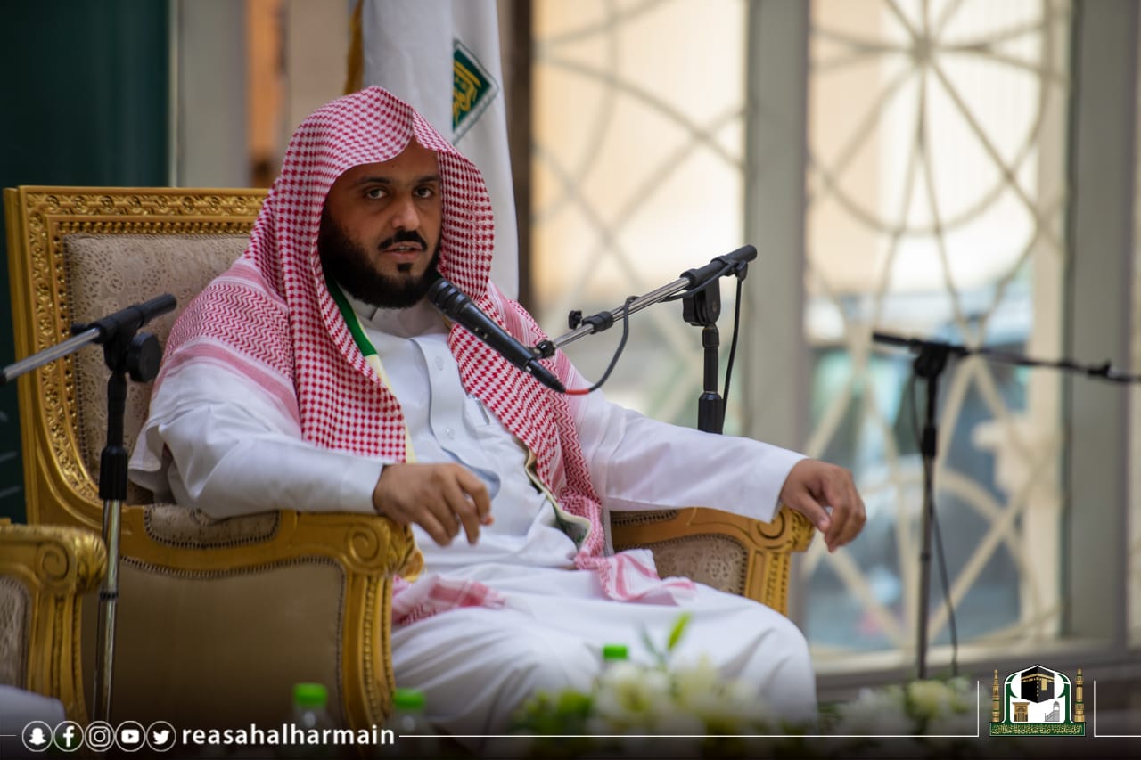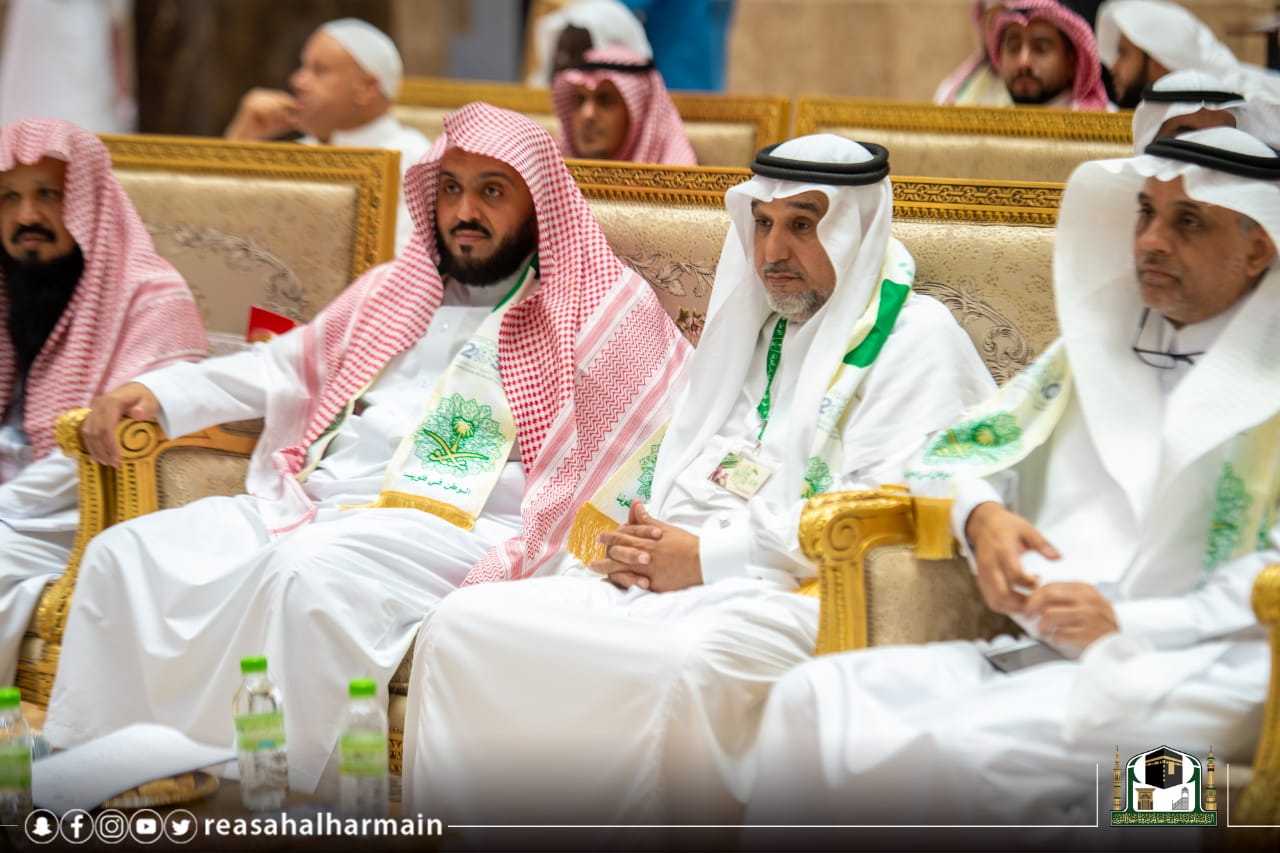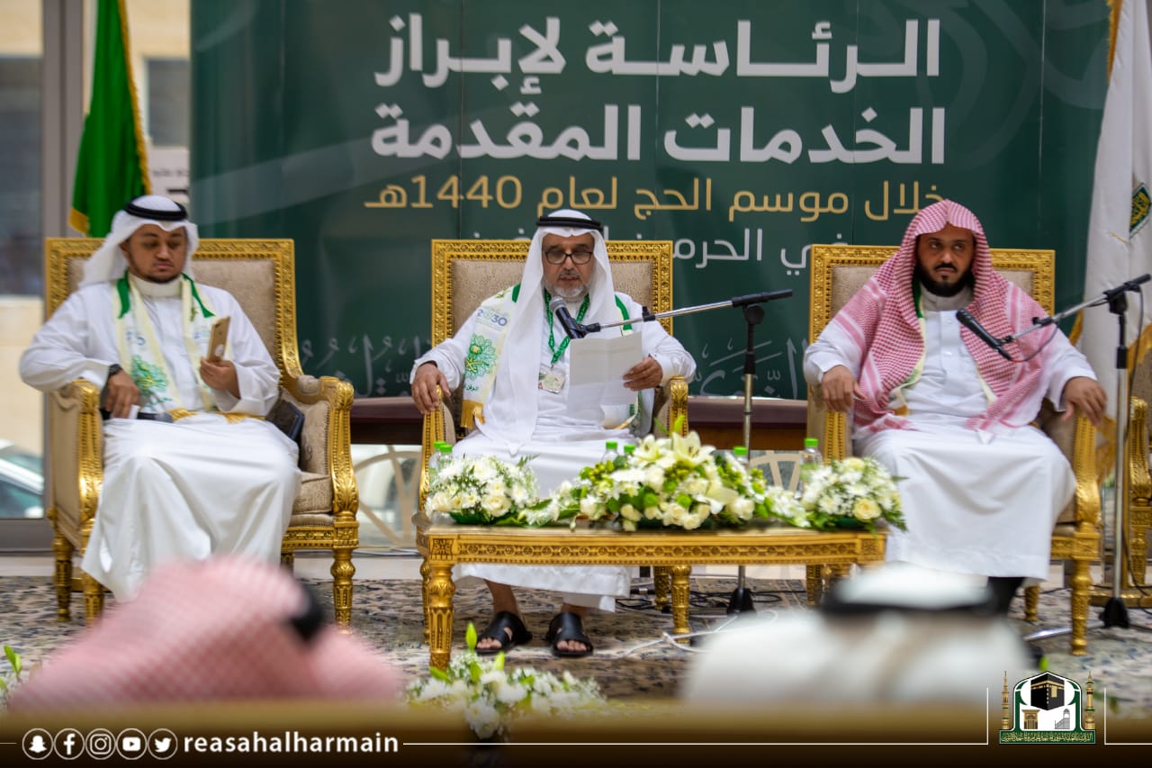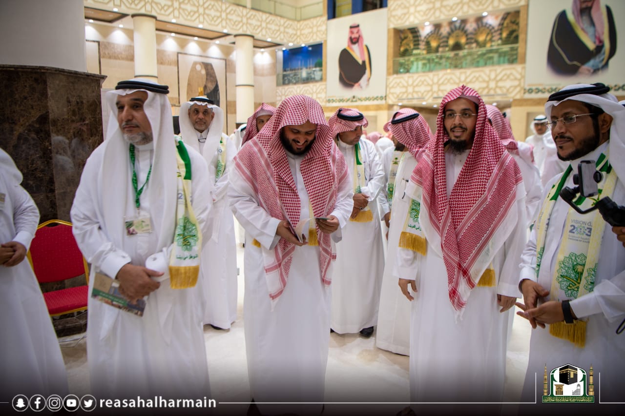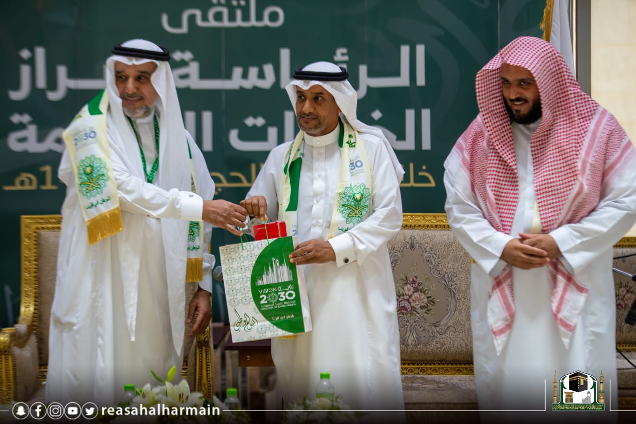 واستعرض اللقاء إنـجازات الرئاسة العامة خلال العام الماضي، ومراحل بناء وتشييد المسجد الحرام والمسجد النبوي منذ تأسيس المملكة العربية السعودية على يد مؤسسها الملك عبدالعزيز بن عبدالرحمن – رحمه الله – إلى هذا العهد الزاهر عهد خادم الحرمين الشريفين الملك سلمان بن عبدالعزيز – حفظه الله – حيث أشاد سعادة وكيل الرئيس العام لشؤون المسجد الحرام الأستاذ أحمد بن محمد المنصوري بقرار إنشاء الهيئة الملكية لمكة المكرمة والمشاعر المقدسة خلال كلمته التي ألقاها خلال الحفل قائلا: (أصدرت الكثير من القرارات التي من خلالها هيأت كافة الخدمات لقاصدي الحرمين الشريفين، ومن بين هذه القرارات التي أنشئت أخيرا إنشاء الهيئة الملكية لمكة المكرمة والمشاعر المقدسة والتي من خلالها سوف تنطلق الكثير من الأعمال لخدمة الحجاج والمعتمرين، وللرئاسة العامة لشؤون المسجد الحرام والمسجد النبوي، في إطار منظومة متكاملة مع جميع الجهات التي تشرف على خدمة الحجاج والمعتمرين وقاصدي المسجد الحرام لتقديم أفضل الخدمات، في ظل قيادة خادم الحرمين الشريفين الملك سلمان بن عبدالعزيز، وسمو ولي عهده الأمين صاحب السمو الملكي الأمير محمد بن سلمان – حفظهم الله -، وبإشراف ومتابعة من مستشار خادم الحرمين الشريفين أمير منطقة مكة المكرمة صاحب السمو الملكي الأمير خالد الفيصل، ونائبه صاحب السمو الملكي الأمير بدر بن سلطان بن عبدالعزيز، وأمير منطقة المدينة المنورة صاحب السمو الملكي فيصل بن سلمان بن عبدالعزيز، ونائبه صاحب السمو الملكي الأمير سعود بن خالد بن فيصل بن عبدالعزيز – حفظهم الله – فنشكر قيادتنا الرشيدة وولاة أمرنا على ما يولونه من اهتمام وعناية بالحرمين الشريفين).