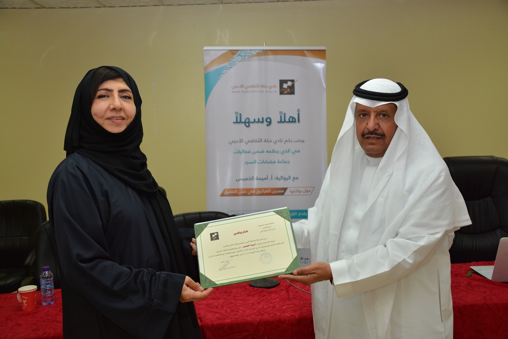 وفي نهاية اللقاء كرّم سعادة الأستاذ الدكتور / حامد بن صالح الربيعي ، رئيس نادي مكة الثقافي الأدبي ، الأديبة أميمة الخميس ، شاكراً لها كريم الحضور وحسن العطاء .