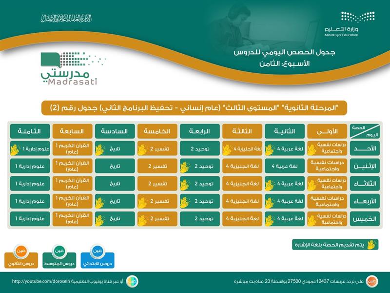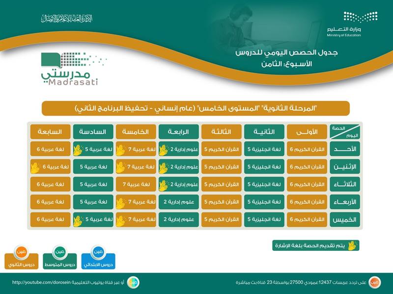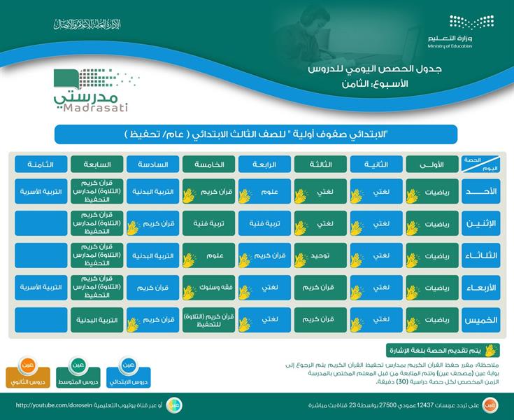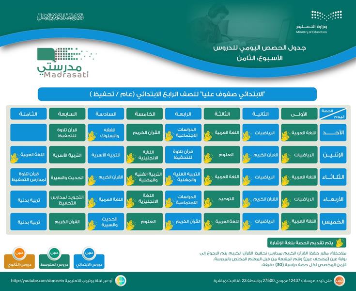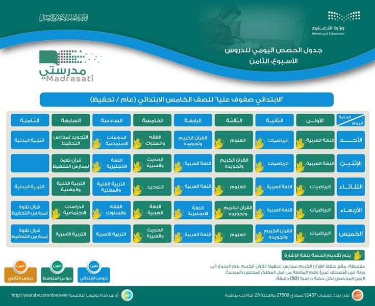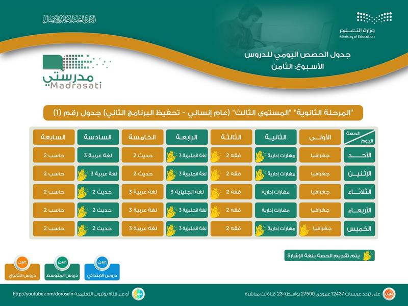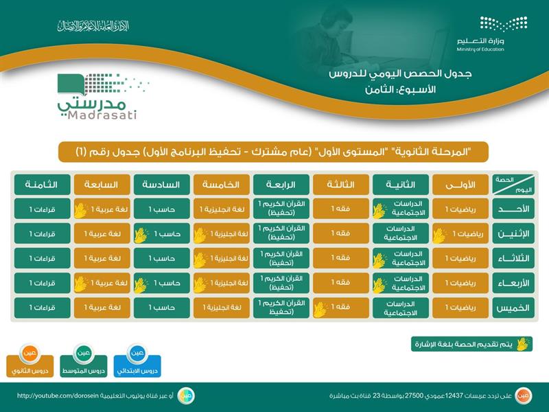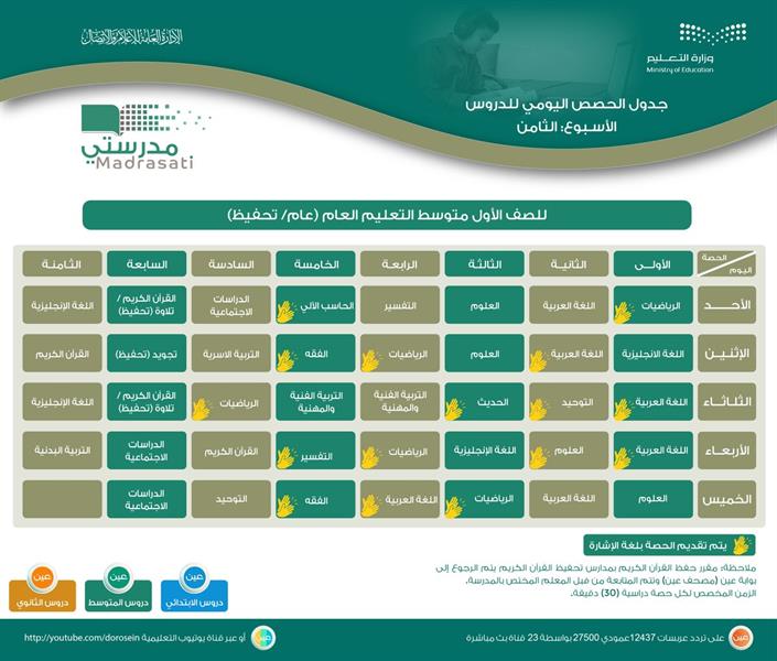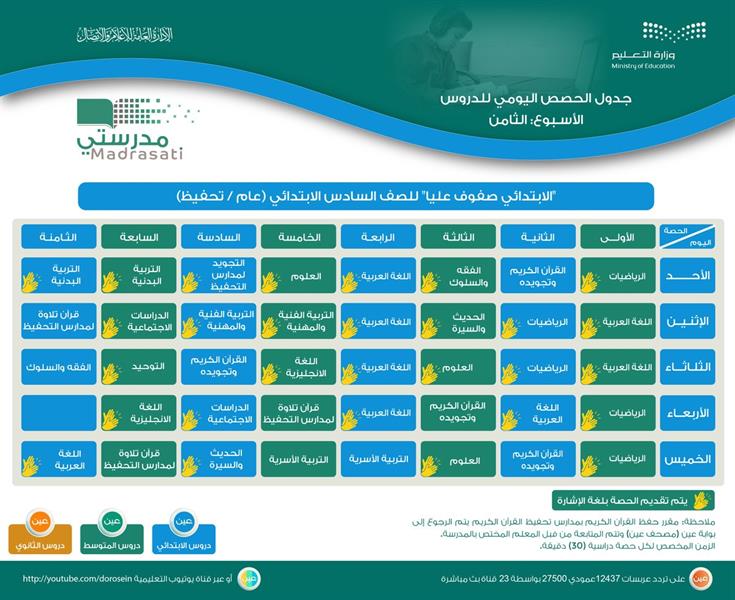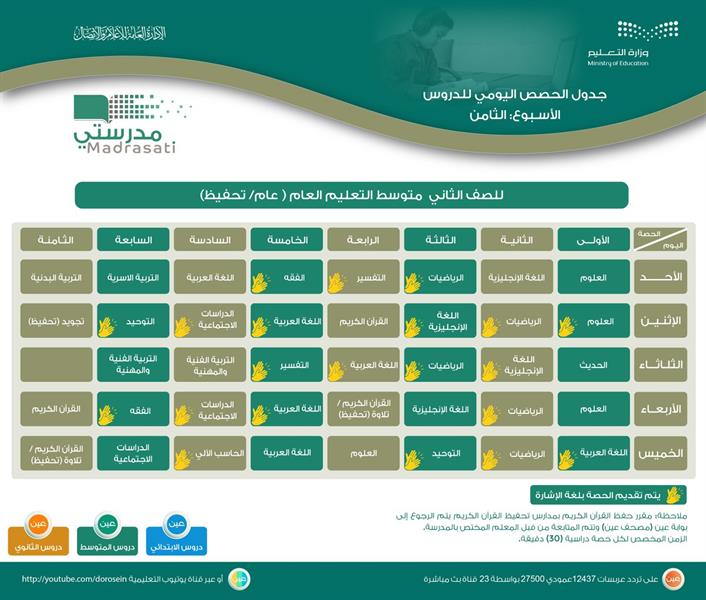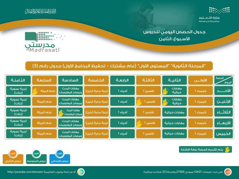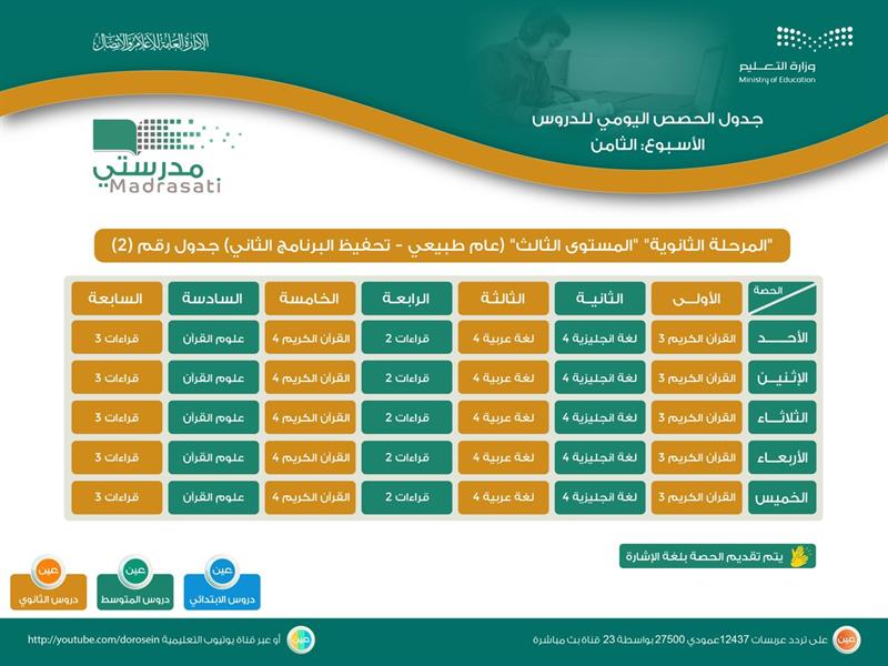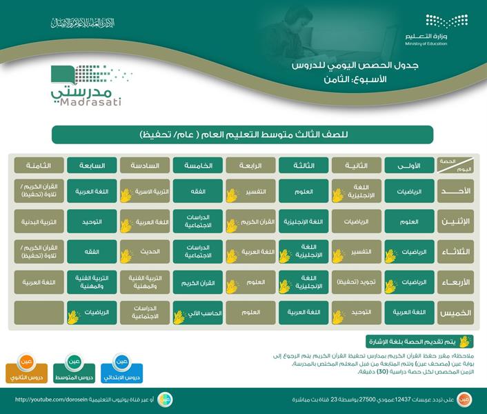 أعلنت وزارة التعليم، اليوم (السبت)، جدول الحصص اليومي لجميع المراحل التعليمية للأسبوع الثامن، وذلك عبر قنوات “عين” على تردد عربسات 12437.