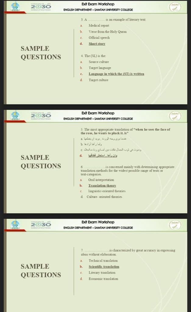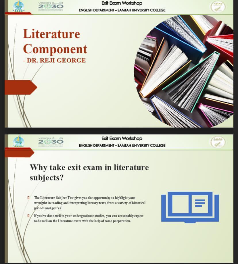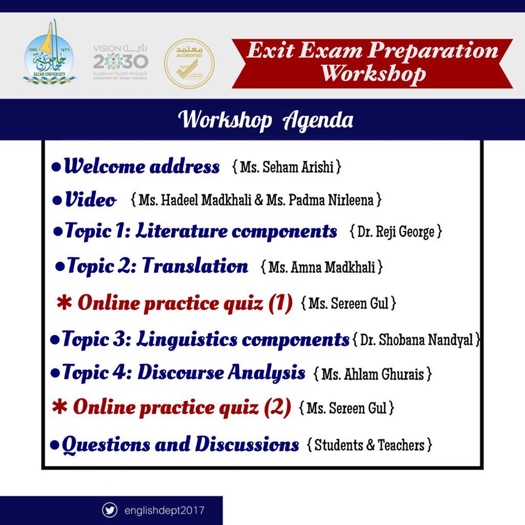 وبدأت الورشة بكلمة الأستاذة سهام عريشي، تلا ذلك عرض لفيديو تعريفي من إعداد كل من هديل مدخلي وبادما نير لينا ثم شرح لمحتويات الاختبار حيث أوضحت الدكتورة ريجي جورج المحتوى الأدبي، فيما تناولت الأستاذة آمنة مدخلي جانب الترجمة كما تطرقت الدكتورة شوبانا نانديال لمحتوى اللغويات التطبيقية إضافة إلى جانب تحليل الخطاب للأستاذة أحلام غريس.